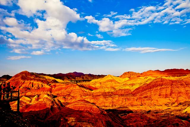 (2)欣赏风景:七彩丹霞在阳光照射下色彩斑斓,美不胜收。